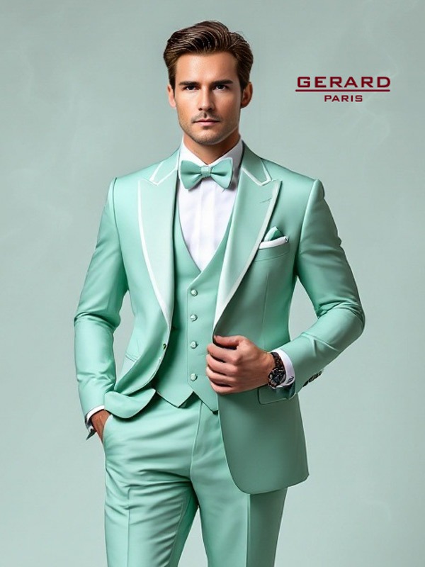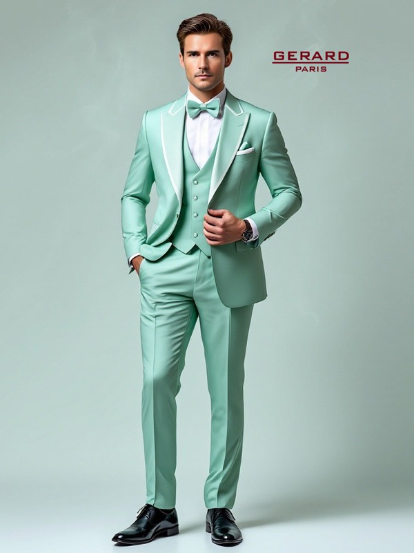 • Jacke: Die Slim-Fit-Jacke in Mintgrün verfügt über ein auffälliges spitzes Revers in einem glänzenden creme ton, das einen luxuriösen Kontrast schafft. Die einreihige Knopfleiste und die schmalen, eleganten Taschen betonen die moderne Silhouette.