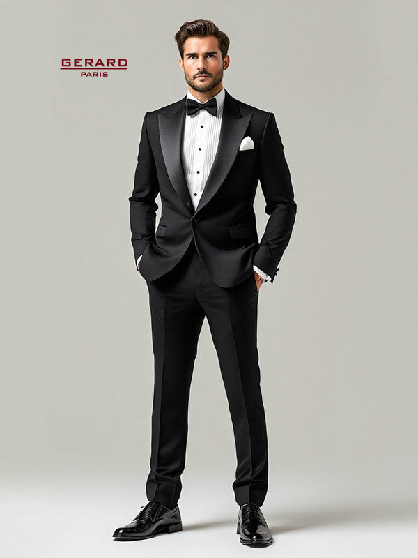 Setzen Sie auf zeitlose Klasse mit unserem Manhattan Black Tuxedo von GERARD PARIS – ein Smoking, der durch seine edle Verarbeitung und sein markantes Design überzeugt. Perfekt für den modernen Gentleman, der bei seiner Hochzeit oder einem Gala-Event einen stilvollen Auftritt hinlegen möchte.