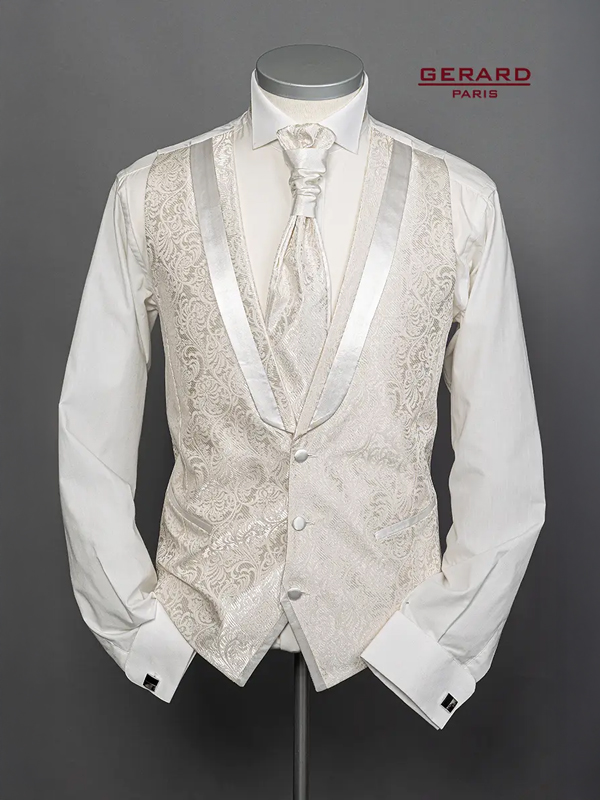 Diese exquisite Hochzeitsweste in Creme Elfenbein ist für Bräutigame gedacht, die einen raffinierten und zeitlosen Look wünschen. Das aufwendige Paisley-Brokatmuster strahlt Eleganz und Raffinesse aus. Der Satinbesatz am Revers unterstreicht den luxuriösen Look und sorgt für einen kontrastreichen Akzent, der das Gesamtbild aufwertet. Komplett mit passender Krawatte und Einstecktuch ist dieses dreiteilige Set perfekt für formelle Hochzeiten und sorgt für einen stimmigen und eleganten Look. Die maßgeschneiderte Passform bietet Komfort und Stil und macht es zur idealen Wahl für einen unvergesslichen Hochzeitstag.